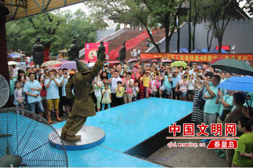 2016年7月7日,記者來到秦皇求仙入海處。在求仙殿廣場的東南方舞臺,伴著富有節(jié)奏感的音樂響起,“泡泡大叔”的街舞表演準(zhǔn)時(shí)開始。他穿著皮質(zhì)的兵馬俑服裝,蹬著黑色軍靴,臉上涂滿灰色油彩。只見他雙腳不動,雙手舞動前伸,身體前傾與地面成45度。固定幾十秒后,身體慢慢復(fù)位站直,又隨著音樂跳起了街舞。大約半個(gè)小時(shí)后,汗如雨下的“泡泡大叔”沖到電扇前吹風(fēng),一口氣喝下2瓶藿香正氣水,又跑回舞臺繼續(xù)表演。